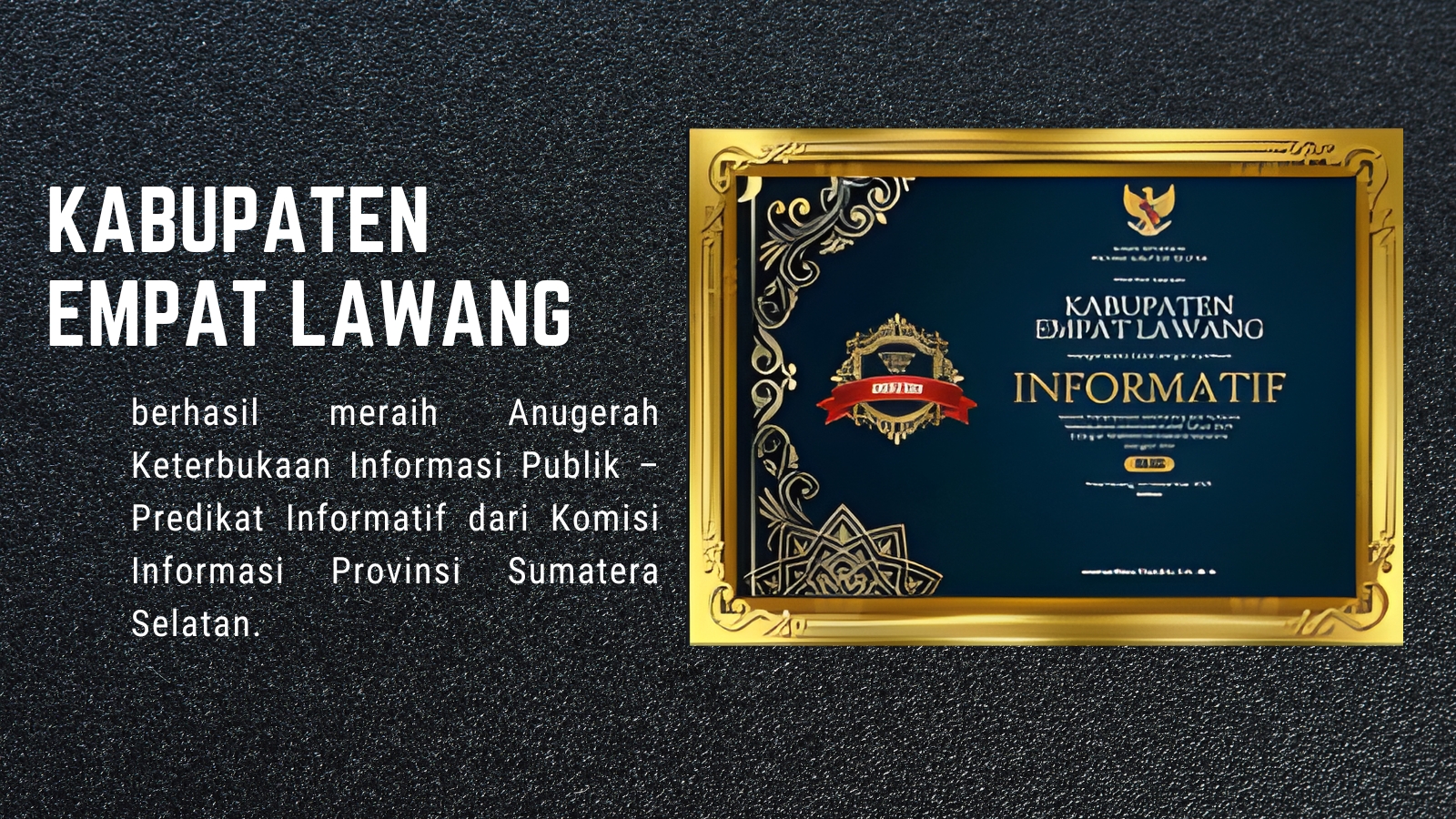 Cakracyber.com: EMPAT LAWANG – Dinas Komunikasi dan Informatika (Kominfo) Kabupaten Empat Lawang berhasil mengantarkan pemerintah daerah meraih Anugerah Keterbukaan Informasi Publik dengan predikat Informatif dari Komisi Informasi Provinsi Sumatera Selatan. Penghargaan ini diberikan sebagai bentuk apresiasi atas komitmen dalam menyediakan informasi publik yang transparan dan akuntabel.